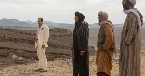 Завязка «Прощенного» такова. По дороге на вечеринку богатых англичан в марокканской пустыне супружеская пара (Рэйф Файнс и Джессика Честейн) случайно сбивает местного паренька, пытавшегося продать им редкое ископаемое, на глазах у его друга, вооруженного пистолетом. Чуть позже на празднество, где все собравшиеся иронически-равнодушно принимают случившееся, заявляется отец покойного и уговаривает Дэвида, героя Файнса, поехать вместе с ним хоронить тело сына.