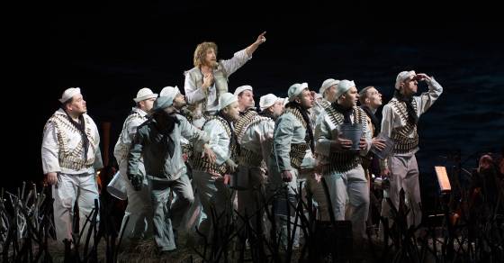 А дальше начинается второй акт — самое интересное, по развитию действия напоминающее эдакую смесь бетховенской оперы «Фиделио» и моцартовской «Свадьбы Фигаро». Возлюбленная Робинзона, Ядвига, приплывает на остров его спасать от чернокожих туземцев-каннибалов, однако сама чуть не становится для них ужином. И пока девушку провозглашают «белой госпожой», ее друзья — Тоби и Сюзанна, — разыскивают Робинзона, и заодно находят еще одного англичанина, Джима Кокса, харизматичного повара, который артистично исполняет песни Булата Окуджавы под гитару. Все больше убеждаясь, что на острове жить невозможно, герои грезят о любимой Англии — «стране, что полна либеральных идей, где не принято жарить и кушать людей», и вот уже сам Робинзон с попугаем Ромео на плече (животные на сцене — все, как мы любим) и сам хочет уплыть от своего шестилетнего пристанища, готов даже сразиться с хитрыми пиратами. К счастью, режиссер устраивает им настоящий хеппи-энд — под звуки симфонической постлюдии и видеопроекции океана на экране, Робинзон, Ядвига, Тоби, Сюзанна, Кокс и даже верный Пятница уплывают в славный город Бристоль.