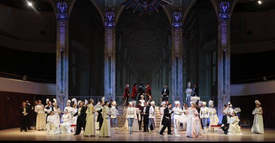 На сцене «Зарядья» развернулось настоящее театральное действо. Несмотря на то, что в программе значилась полусценическая версия, спектакль Алексея Степанюка и художника-постановщика Вячеслава Окунева можно было с уверенностью назвать полноценным. Минимальный интерьер, контурно показывающий место действия — богатый дом, бал князя Орловского и тюрьма —вписался в сценическое пространство весьма удачно. Для большего погружения в то или иное событие над сценой также расположилась видеопроекция (художник по видео — Виктория Злотникова). Наибольшую трансформацию потерпел зрительный зал — часть партера превратилась в оркестровую яму, в которой разместились музыканты и маэстро Гергиев. Несмотря на условную концертность исполнения, отчасти предполагающую строгий, абстрактный внешний вид, внимание привлекали роскошные костюмы конца XIX века, загадочные мерцающие маски, скрывающие истинный облик гостей бала. Не обошлось без эффектных танцевальных номеров. Канкан, чардаш, вальс, да и просто веселую суматошную беготню на карнавальном вечере показали и вокалисты, и артисты балета и миманса (хореография Ильи Устьянцева). Словом, это был самый настоящий красочный спектакль в лучших традициях музыкального театра, вовлекающий в праздничный вихрь, заставляющий смеяться, сопереживать, восхищаться и следить за развитием событий, затаив дыхание.