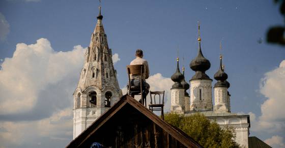 «День бытия» в Суздале 6 августа начался с солнечных медитаций и песен на рассвете. Накануне ночью стартовал 22-часовой спектакль режиссера Дмитрия Мышкина — это длительное театральной действо, в котором актеры в метавселенной Антона Чехова разыгрывают репетицию постановки по пьесе Треплева, героя «Чайки». День был наполнен программой спектаклей под открытым небом — в полях, на берегах Нерли, в заброшенных зданиях, на площади и во дворе. Для местного сельского театра в Фомихе (поселение на юго-востоке от Суздаля, примерно в 15 километрах) это привычная практика. Актеры и режиссеры почти в любую погоду создают спектакли-путешествия, экскурсии. Они рассказывают истории и приглашают зрителей к активному участию в действии.