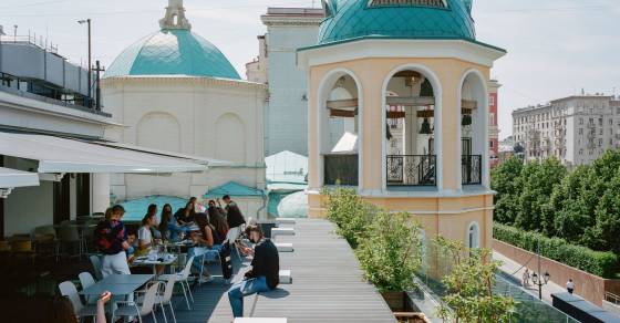 White Rabbit, только что поднявшийся на 13 позицию в рейтинге The World’s 50 Best Restaurants, принимает гостей на веранде на 16 этаже «Смоленского Пассажа». Удобная раздвижная крыша прячет гостей от солнца или непогоды, а теплые пледы согревают в прохладный вечер. Веранда ресторана Mushrooms занимает часть крыши торгового центра «Гименей». Отсюда отлично видно почти все Замоскворечье. А вот терраса ресторана «Сахалин» предлагает один из лучших видов на город. Она круговая, так что можно рассмотреть и старинные церквушки, и башни Москва-Сити, и сталинские высотки (особенно здание МИДа), и еще раз убедиться: Москва — лучший город земли.
