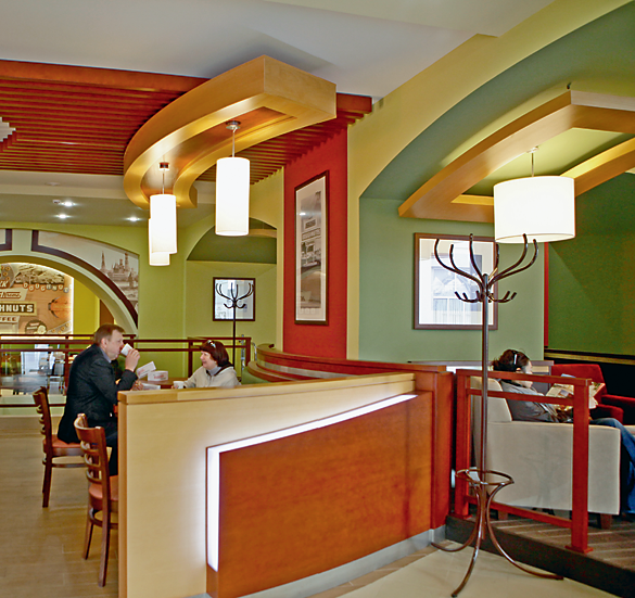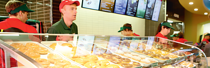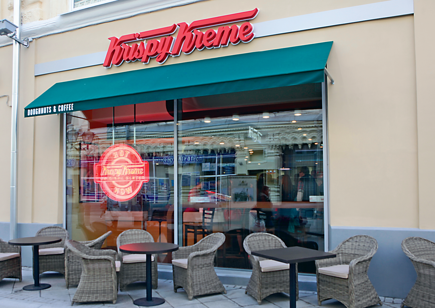В ассортименте московского Krispy Kreme 16 пончиков. «Оригинальные» выпекают на месте. Можно даже посмотреть за процессом из-за стекла — открытую производственную линию здесь называют «театром». Остальные привозят с фабрики-кухни. Половина — обязательный для всех 23 стран, где работают кофейни сети, набор: ринги (пончики с дыркой) с сахарной и шоколадной глазурью, шеллы (пончики без дырки) с заварным кремом и шоколадом, клубничной, яблочной, малиновой начинками. Есть рецепт, разработанный специально для России, — шелл «Грильяж», правда, орехи на нем только сверху, а внутри карамельный крем. Точно так же когда-то для британских Krispy Kreme был придуман ринг с клубничной глазурью, похожей на перламутровый лак для ногтей, а для Америки — шелл «Чизкейк Нью-Йорк» с сырным кремом и крошкой из медового печенья. Оба они теперь вошли и в московское меню.