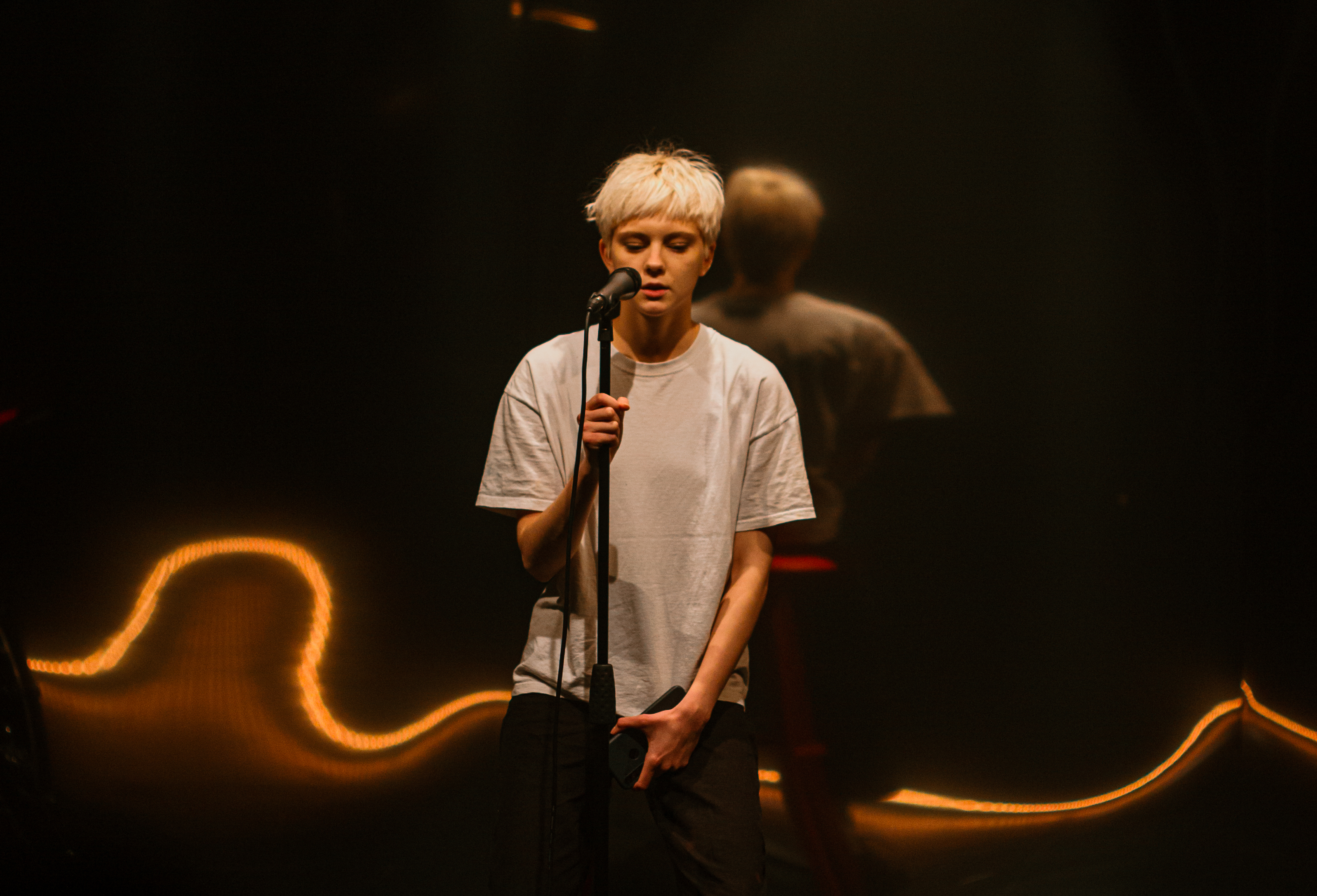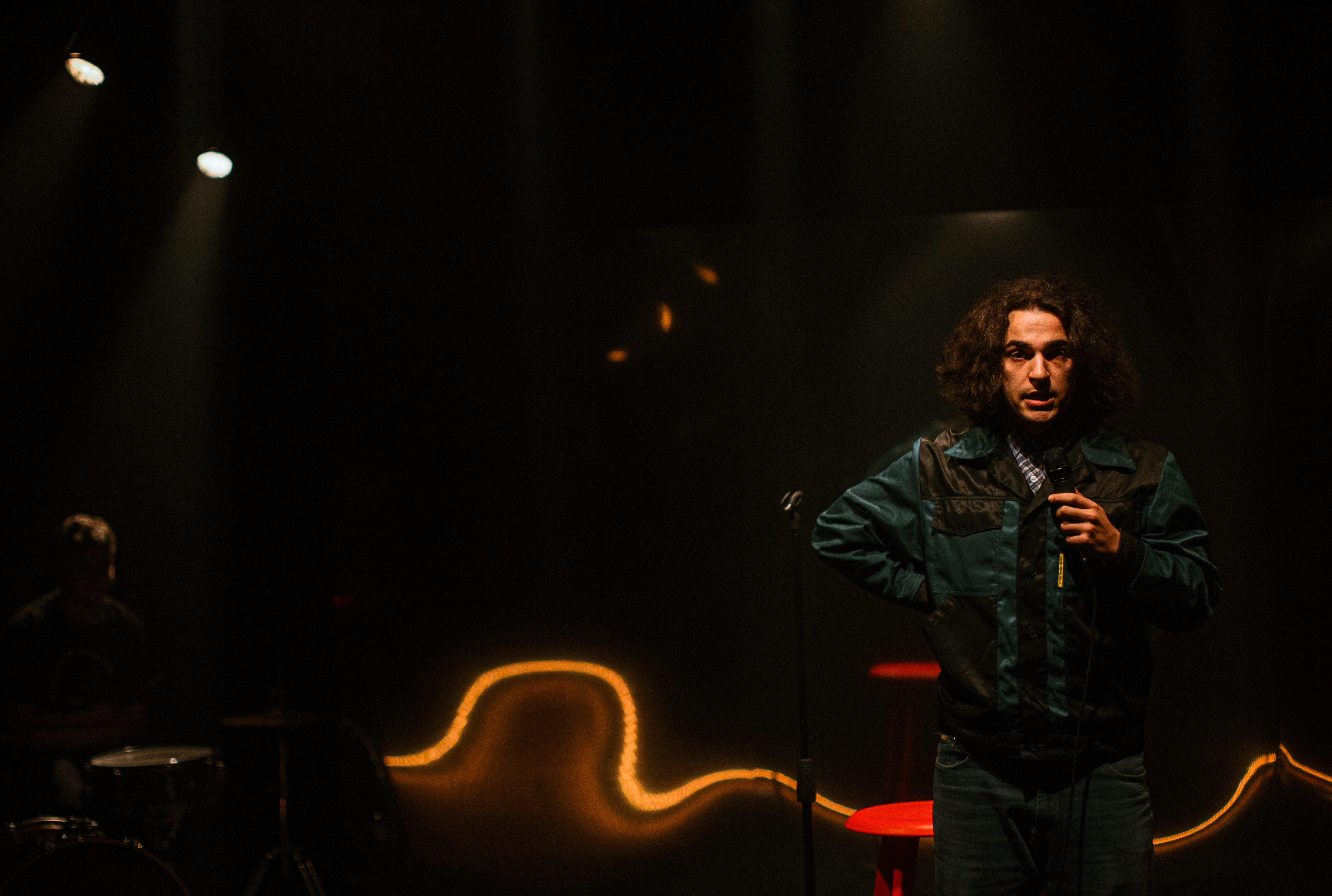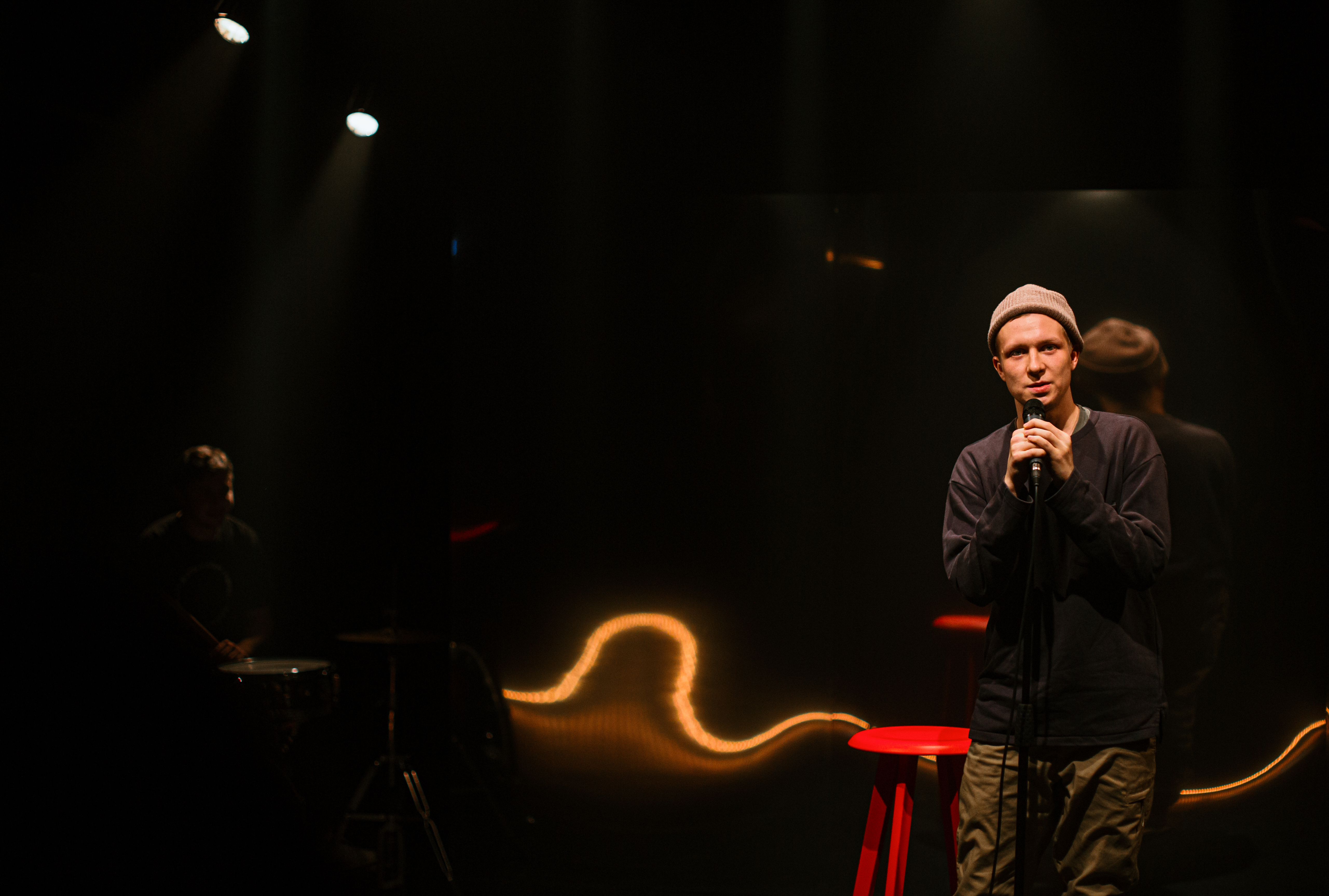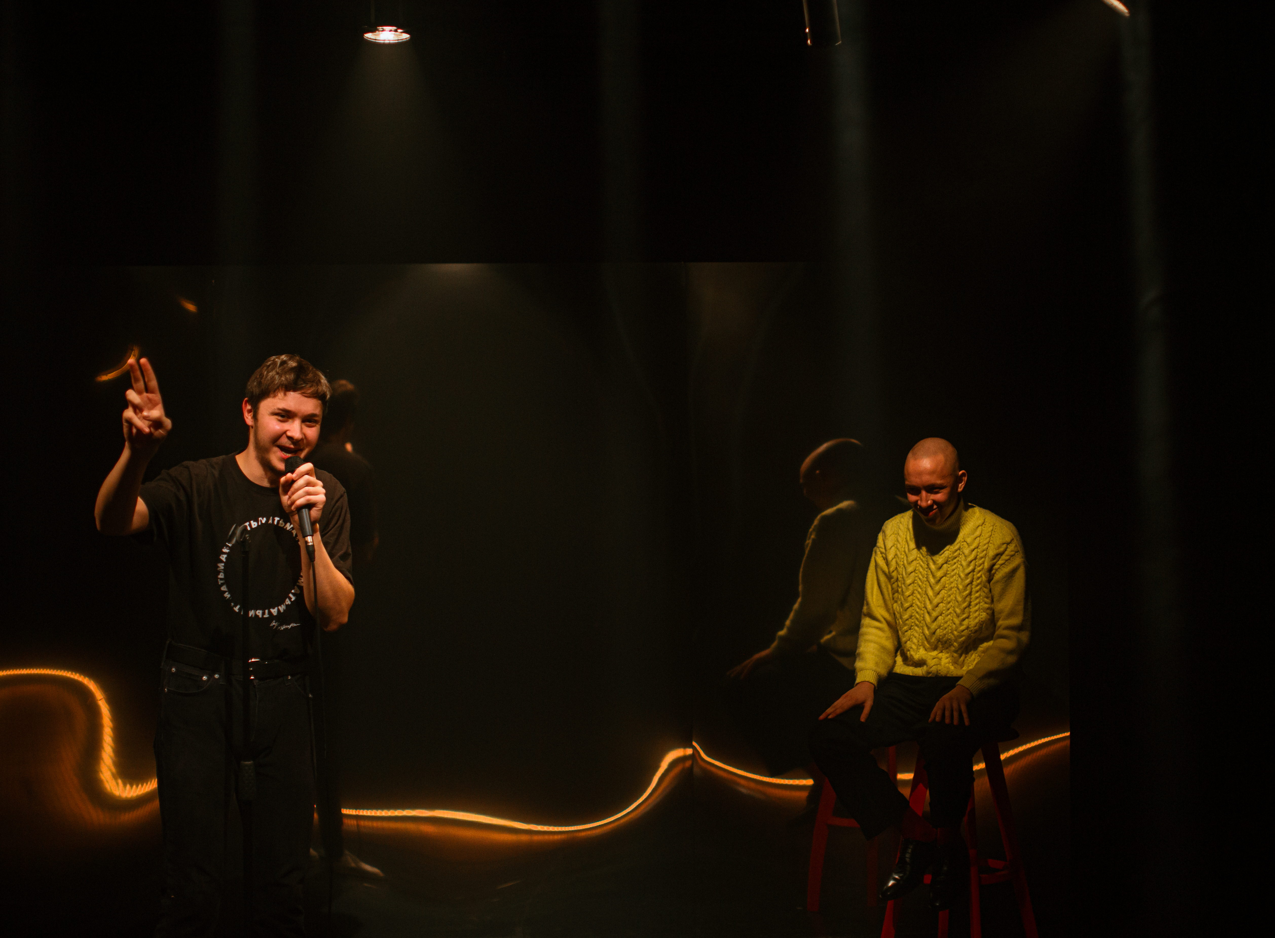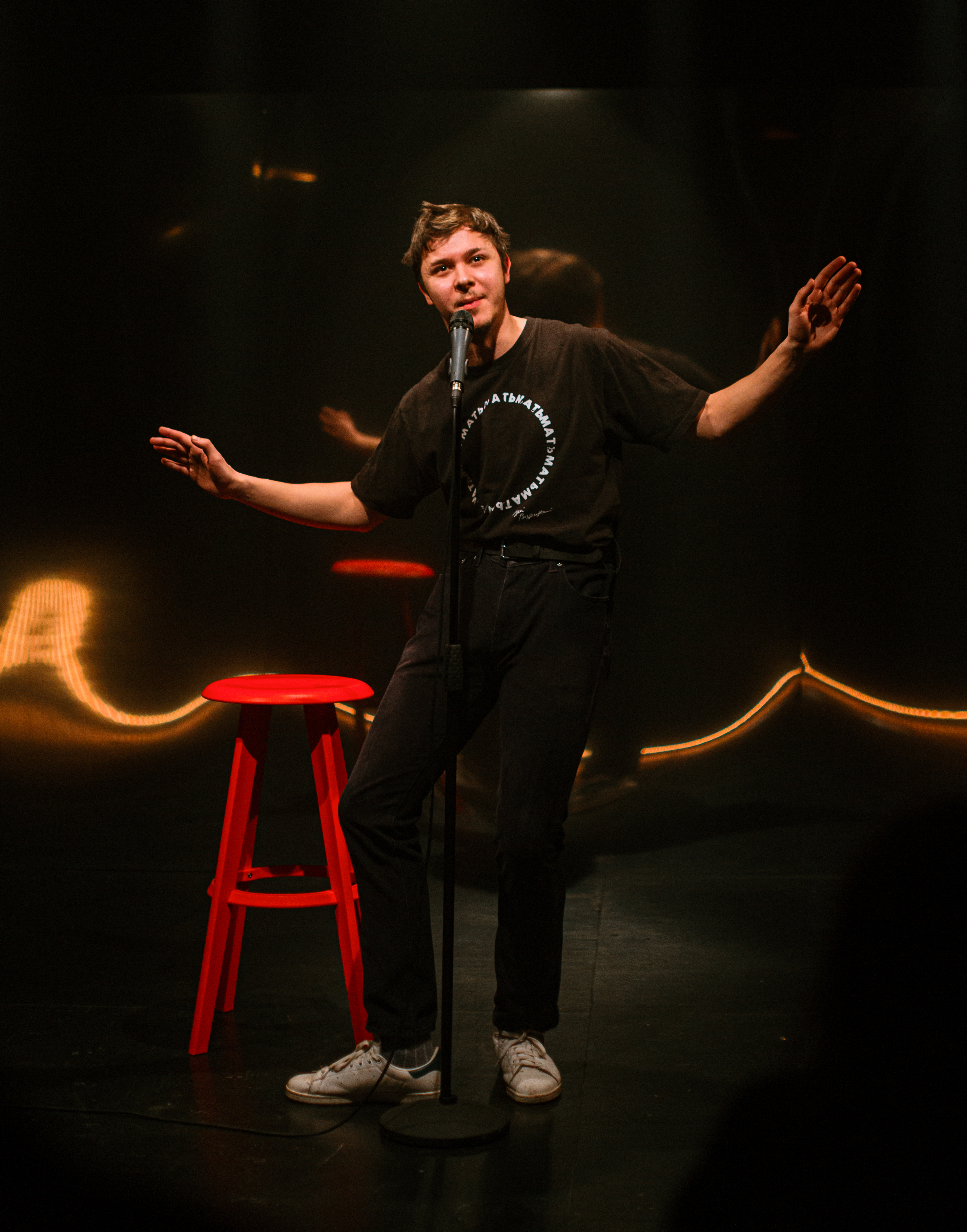 На «открытых микрофонах» стендап-комики представляют публике новую программу. Удачна она или нет — определяет зритель*. Артисты Мастерской Олега Кудряшова приоткрывают дверь между мирами театра и стендапа — не таких уж разных, как могло казаться со стороны.
