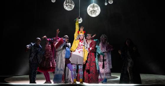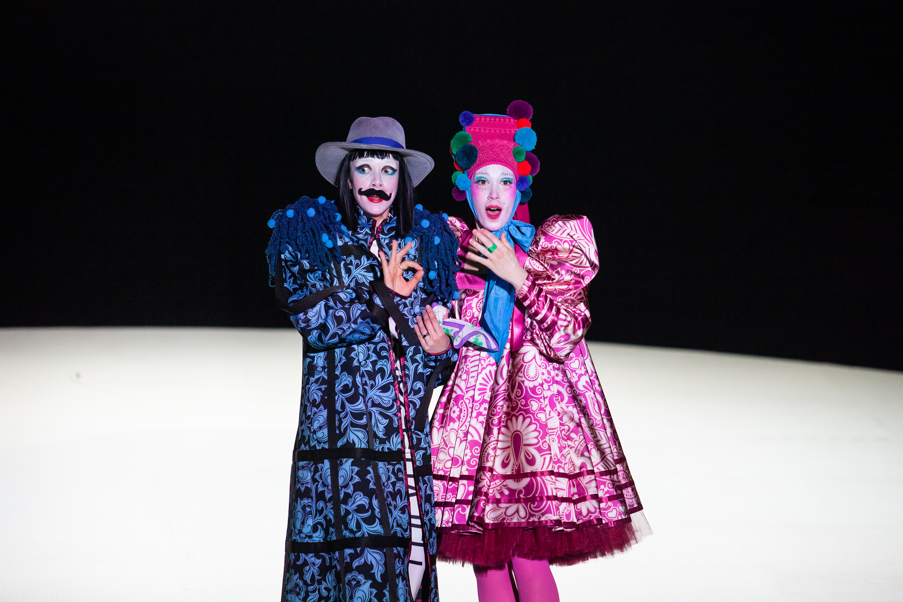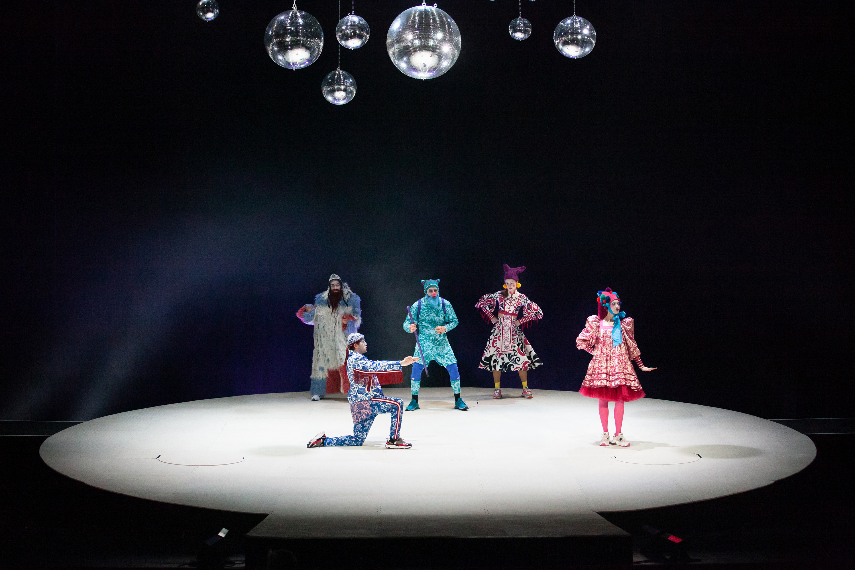 Что получилось — во-первых, изменить внешнюю оболочку: пьесу играют этакие осовремененные русские скоморохи, одетые во что-то вроде того, как в мире моды показывают одежду а-ля рюс, современная музыка и танцы, во-вторых, взаимодействие с залом сильно оживляло, ну и, в-третьих, актеры молодые, энергия из них бьёт ключом, всё было очень задорно.