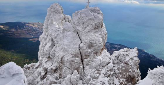 Для тех, кто истосковался по снегу, — прямая дорога на одну из самых живописных вершин Крыма — гору Ай-Петри. Общественным транспортом до нижней станции канатной дороги «Мисхор – Ай-Петри» можно добраться из Ялты маршрутными автобусами. Билет на вершину обойдется вам в 400 р. (обратный — столько же). Приезжайте туда утром, чтобы времени на все хватило и вы успели спуститься вниз до темноты — зимой в Крыму солнце заходит после 17 часов.